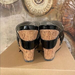 Stylish black patent wedges. Sleek and versatile design. Perfect for any occasion. 4 inch heel wedge very comfortable shoes! Only worn once! Make an offer!!!