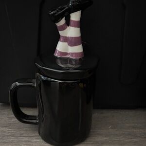 Charming black mug with a playful witch legs lid. Perfect for Halloween enthusiasts.