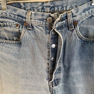 These have all original rivets and buttons . Patched in crotch area, right and left knee areas. (the patches are invisible from front of denim but reinforce a worn area and last forever) Light fraying on back pockets All pockets original and in good condition.These were 34 waist X 34 Length, THEY HAVE BEEN ALTERED. to boyfriend jeans to fit a petite woman...waist is now 32" Length top of waistband to bottom of leg along the side 38 ".they have been shortened to 28 1/2" inseam and thighs have been taken in to approximately 22"wide.. they were very baggy. Original seam inside inseam , altered on outside seam. Please ask for more photos Photo 13
