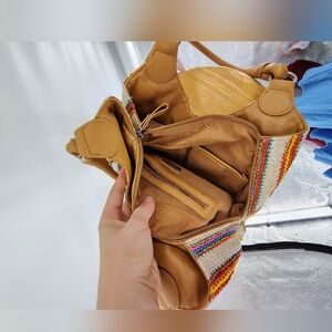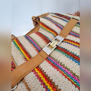 Stylish Rosetti bag with colorful stripes. Features tan handles and trim. Perfect for adding flair to any outfit.
