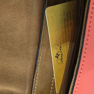 Stylish Patricia Nash coral and brown crossbody bag with card, features a chic buckle design. Perfect for adding a pop of color to any outfit.