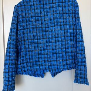 Stylish tweed blazer with a classic check pattern. Features a vibrant blue and black design. Ideal for adding elegance to your wardrobe.