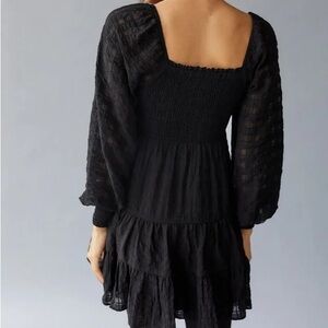 Chic black dress with long sleeves. Smocked bodice and tiered skirt. Perfect for versatile styling.