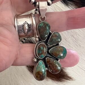 This exquisite piece is a Southwestern-style cluster ring, crafted from 925 sterling silver and featuring a prominent display of Paloma Variscite gemstones. The ring showcases a central oval variscite stone encircled by eight smaller, similarly shaped variscite stones, all set in a classic cluster arrangement that evokes a floral motif. The stones exhibit a unique light green hue, characteristic of Paloma Variscite, making it a distinct piece. The design is further enhanced by a detailed sterling silver rope-twist border surrounding the cluster, adding a traditional Southwestern touch. This particular ring is a size 8 adjustable, providing flexibility in sizing, and is designed to fit comfortably around a size 8 finger, or adjusted slightly for a similar fit.