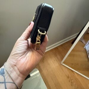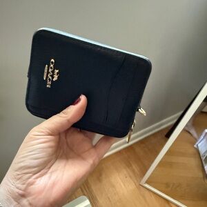 Elegant black leather wallet by Coach. Features gold zipper and logo. Multiple card slots included. The chain broke so it’s not with the chain .still in great condition not scratches
