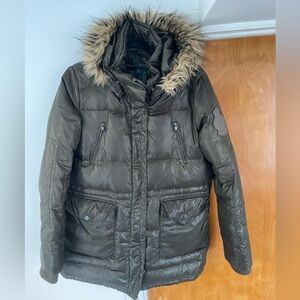 This elegant deep orange and gold silk coat is 100% silk and features a subtle but luxurious mink trim, perfect for adding a touch of sophistication to any outfit.