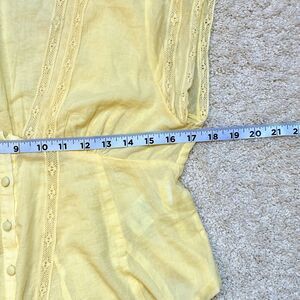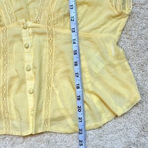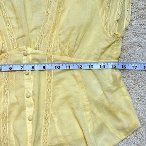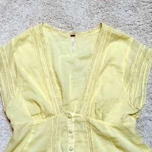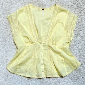 SOLD Free People Yellow V Neck Button Up Ruched Lace Flutter Sleeve Blouse Top S