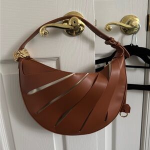 Stylish brown shoulder bag with unique cutout design. Features gold hardware and adjustable strap.