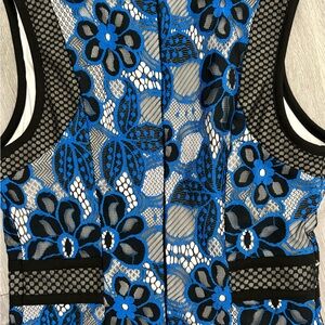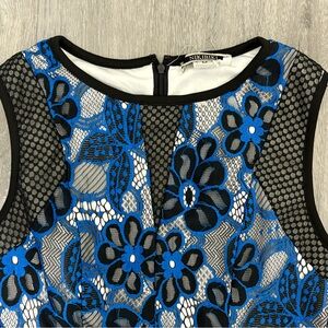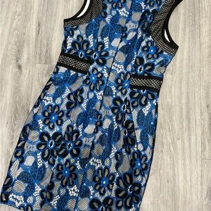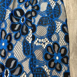 Chic midi dress with bold floral lace. Features striking black and blue design. Fully lined.