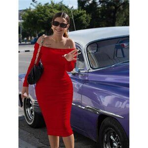 Women Sexy Off Shoulder Long Sleeve Dress Red
