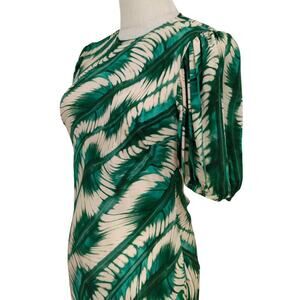 A classic Ulla Johnson silhouette, the Ines Dress is defined by voluminous puff sleeves and sleek, bias-cut that skims the body. Made from silk crepe de chine, it has a feather-like shibori print with undulating waves in vivid green and cream. This midi dress fastens with a back buttoned keyhole.