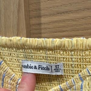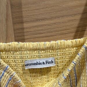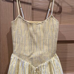 Chic yellow midi dress with delicate stripes of blue and white. Features a fitted bodice, adjustable shoulder straps and flowing skirt. Ideal for warm weather outings. Size small tall.