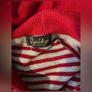 Vibrant red and white striped hoodie by Gushy. Perfect for casual outings. French girl with jeweled detail in her hair and hat. Long sleeves with front pocket