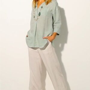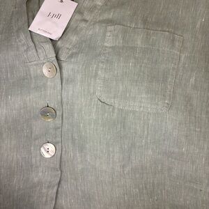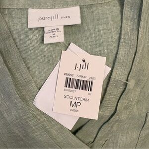 NWT still attached J. Jill Pure Jill size MP medium petite 100% Linen succulent cream (Sage Cream) with 3 mother of pearl button front pop over with a pocket on the left chest tunic.