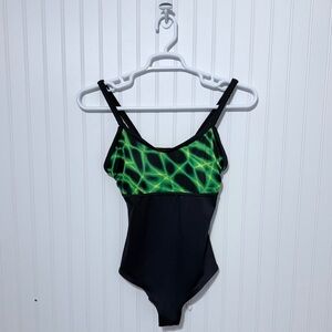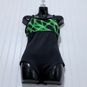 Stylish women's swimsuit featuring a vibrant green and black design. Perfect for a day at the beach or pool.