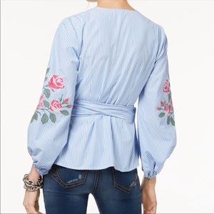 blouse with floral embroidery and a self-tie sash belt.