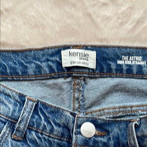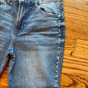 Elevate your style with these chic blue jeans featuring elegant rhinestones down sides. Medium wash, material has a little stretch, excellent condition.