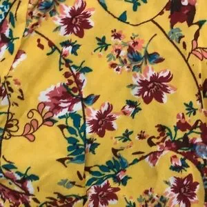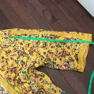 Elegant kimono featuring vibrant floral patterns. Accentuated with a yellow lace trim.