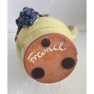 This small French pottery pitcher with 3-D grapes is a vintage piece made in France in 1975. The pitcher stands at 5 inches tall and holds 12 ounces of liquid. It features a glazed finish. The pitcher showcases a French style with a multicolor design, making it a unique addition to any kitchen or home decor collection. Handmade and with handles, this original piece is perfect for all occasions and adds a touch of food and drink theme to your table setting. EXCELLENT condition without chips or breaks.