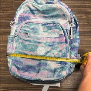 Vibrant tie-dye backpack with a fun monkey keychain.