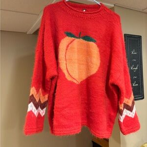 Bright red sweater with a bold peach design. Perfect for a stylish look. Oversized, soft, barely worn.