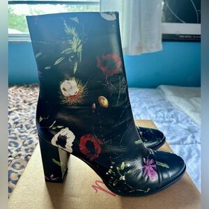 BEAUUUUUUTIFUL bootie with an easy to walk in heel! Originally bought from DSW, I use to wear these when i worked in an office, but haven't worn them in years. As you can see in the pics, I've hit the streets in them- reflected in price. They still have a lot of life left in them though, and are ready for a new home! A covered block heel and a neat cap toe update the look of this striking ankle bootie.