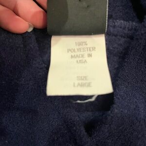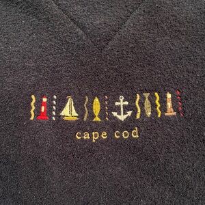 Navy Blue fleece “Cape Cod” V-neck hooded pullover sweatshirt. GUC!