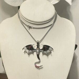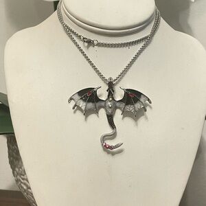 Embrace your unique style with this stunning silver dragon pendant necklace. The intricate design features striking red accents, perfect for adding a touch of fantasy to any outfit.