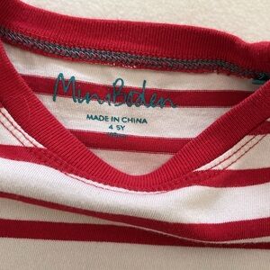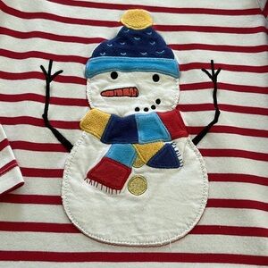 Adorable appliquéd snowman long sleeved shirt in red and white stripes. Size4-5 yr. In great condition! See photos. By Mini Boden