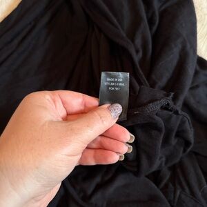 This is a basic black dress but with an elevated sexy kick. Super soft rayon in a maxi length. High neckline and it even has a large front pocket! Stretchy material. The slit is high and above the knee on one side! Classic and can be dressed up with heels for date night or special event, or kept casual with flats or sandals! In excellent used condition!