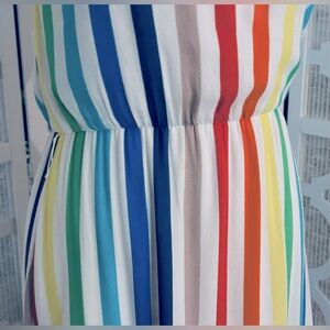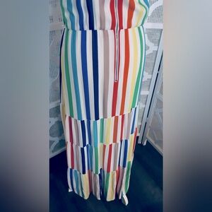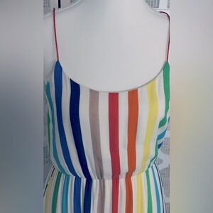 I have for sale this gorgeous Alice + Olivia Janan Rainbow Stripe Tiered Sundress. It has a a flowing silhouette and spaghetti straps. This is a size 2. I really love the clothing made by Alice + Olivia it’s very classy and beautiful. This dress has such a gorgeous shape. It makes a very beautiful silhouette when worn. There is a lining underneath and the top fabric is here. There is a zipper down the back as shown in the photos.