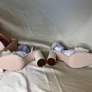 Pleated knot heeled sandal in white fabric. Padded footbed with gold stamped logo. Open toe with adjustable buckle ankle strap. 3.5 inch heel. Made with all vegan materials.