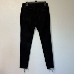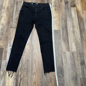 Chic black skinny jeans with frayed hems. Ideal for casual style.