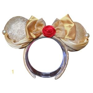Cinderella’s castle in gold with fireworks shooting up into the sky. These are magical ears! The bow looks like the shimmer is silvery in the photos, but it is purple sparkling on the bow of the headband in person. Very nice and elegant ears! See photos for all details.