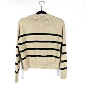 Elevate your style with this chic striped V-neck sweater. Featuring a classic tan and black color combination, this sweater is perfect for any occasion. Its comfortable fit and timeless design make it a wardrobe essential. Good pre-owned condition. Approximate measurements: 20" chest, 20" length.