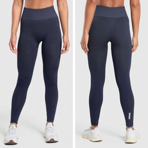 Gymshark Sport Seamless leggings in Heavy Blue / Iron Blue. Dark navy blue with white logo on the lower leg.
