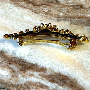 The design of the hair clip is approximately 3” long and 3/4” wide and is set with an antiquated dark gold finish for a vintage style look.