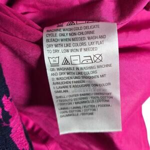 Features a bold berry and navy floral design throughout
