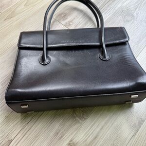 Elegant black leather handbag by Adrienne Vittadini. Features sturdy handles and a sleek design. Minor wear.