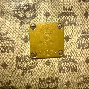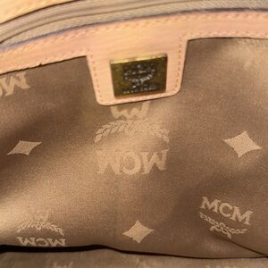 Elegant MCM satchel with signature monogram. Features black and cream tones. Stylish and functional design.🩷