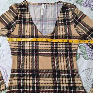 Women's CHOCOLATE Striped Plaid Long Sleeve Beige Bodysuit Size M