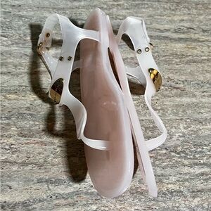 Elegant white sandals perfect for any occasion. Comfortable and stylish design. Size 7. No box. In good condition no rip or tear. Notice a stain on one of the sandals as shown in the pictures. Gold name tag