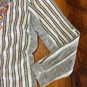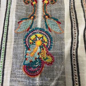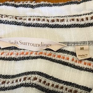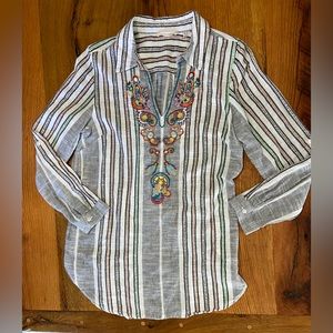 Soft Surroundings 100% cotton lightweight v-neck pullover top with fabulous details, pocket, roll-tab long sleeves, beautiful embroidery, length is about 29,” PTP is about 19,” size Medium