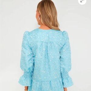 Chic light blue dress with floral design. Features long sleeves and tiered skirt. Perfect for any occasion.