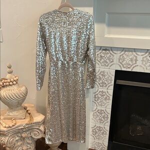 Stunning silver sequin wrap dress. Long sleeves. Perfect for evening events.