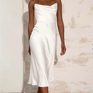 Elegant white midi dress by Jenny Yoo. Features a sleek silhouette and delicate straps. Perfect for formal occasions.