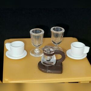 Sylvanian families/calico critters plastic furniture and accessories: square table, 2 chairs, 2 glasses, 2 cups with saucers, and 1 coffeemaker.
