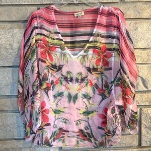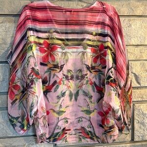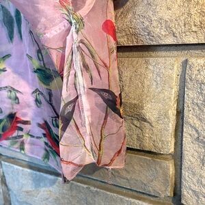 Pink sheer kimono sleeves blouse with vibrant floral and bird design. Features pink, red, and green hues.