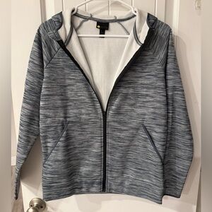 Stylish raincoat with a hood. Features a zip closure and pockets. Perfect for rainy days.