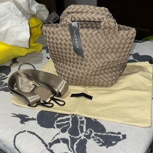 Chic Tory Burch tote featuring a transparent design. White trim with tan handles. Ideal for versatile styling.